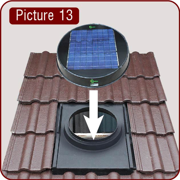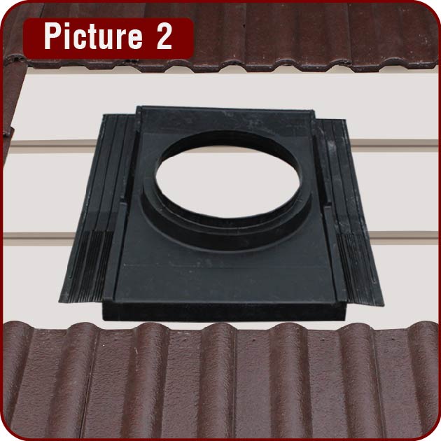 Position the flashing in the opening, making sure the turret opening is positioned between the rafters and clear of any other obstructions. Avoid rafters to be in between the openings for optimal air flow. (Picture 2)