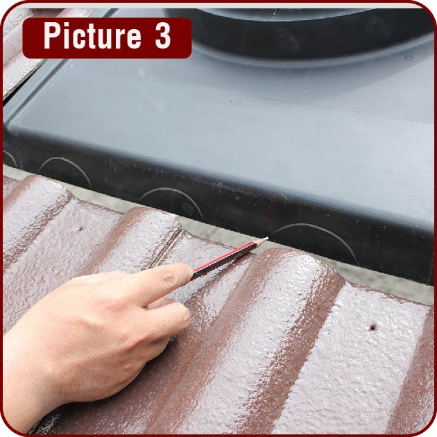 Once the flashing is correctly positioned, bring the front skirt of flashing up against the back edges of roof tiles and trace profile of roof tiles onto the front skirt of the flashing.(Picture 3)