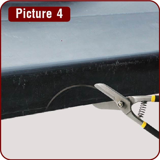 Remove the flashing and cut out marked sections on the front skirt using tin snips. Right hand and left hand tin snips may be required occasionally for an accurate cut. (Picture 4)