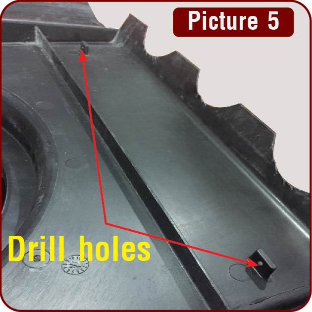 Drill two 6mm holes through the nips the under the front of the flashing. This is to accommodate cable ties. (Picture 5)