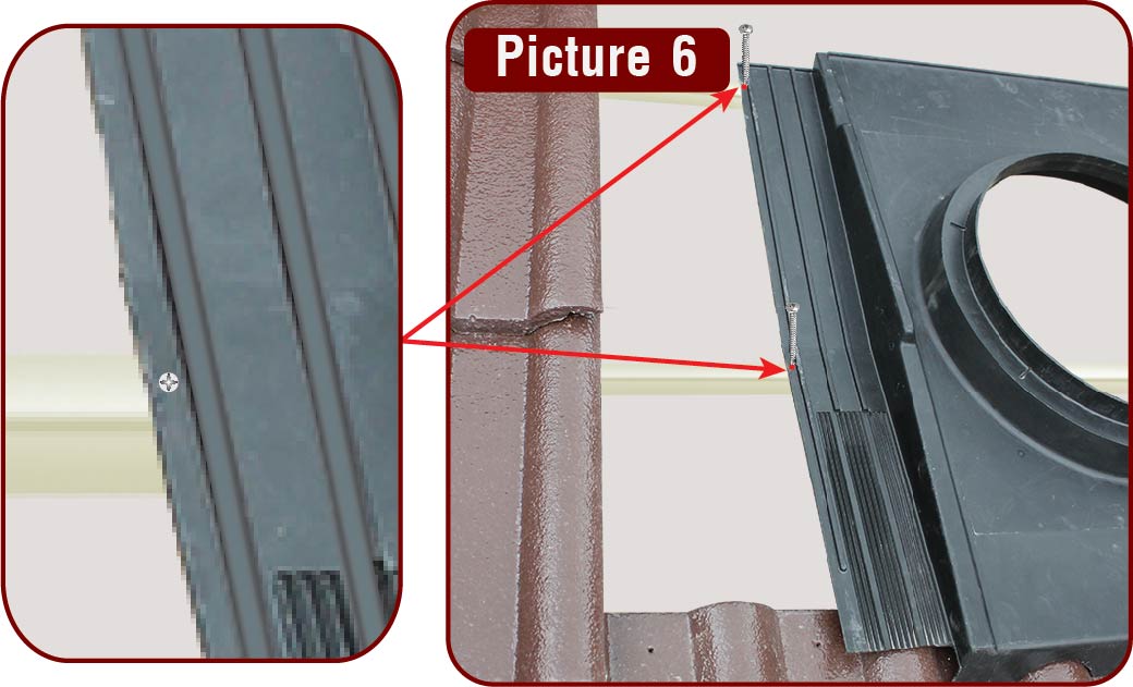Fit the flashing into position, making sure the front skirt of the flashing is in line with the front edge of the first 2 side tiles or position the transition line of both side wing section along the front edge of the center battens. Secure the flashing to center and top battens with 4 roof self tapping screws (supplied), placed at most outer edges of the wing sections. Ensure that the wing sections are not sloped sideways otherwise water may leak in. (Picture 6)