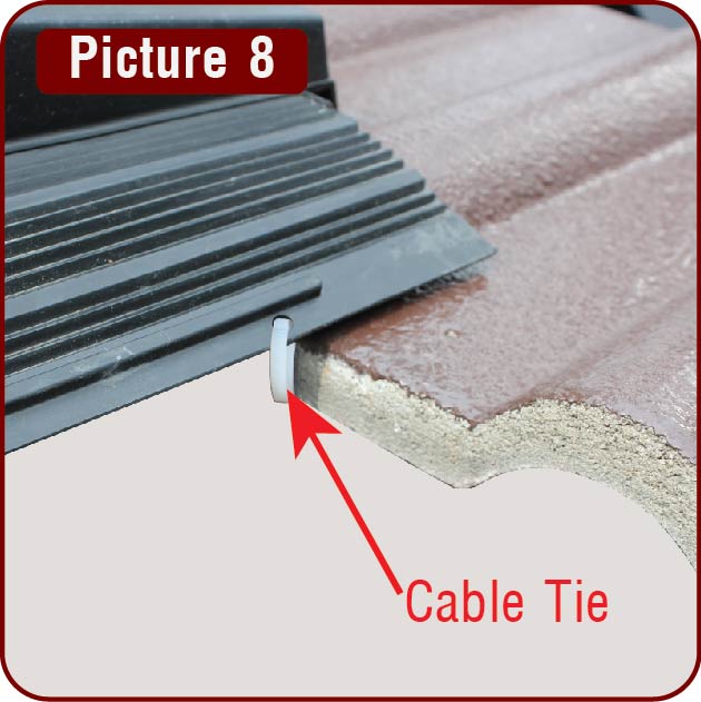 Drill a 6mm hole at outer edge of the wing section just behind the back edge of the lower roof tiles. Then pass cable tie through hole and around tile batten. Carefully tighten cable tie to form front wing section over shape of roof tile. (Picture 8)