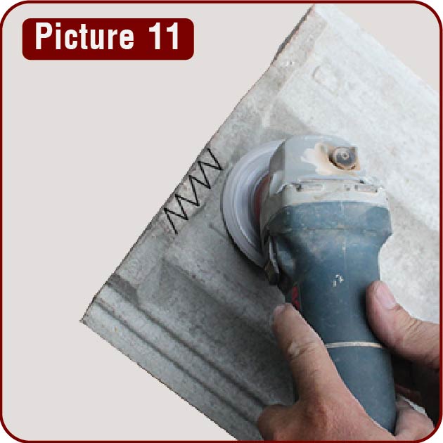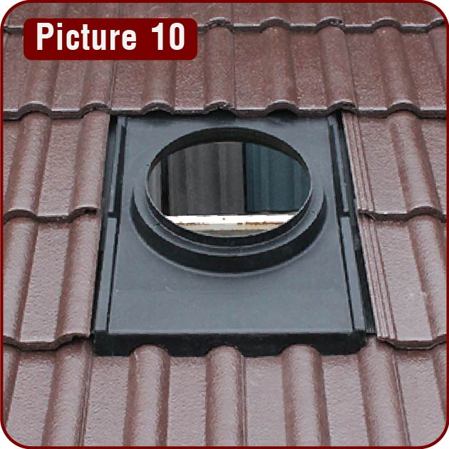 Where there is less than a full tile to fit; measure and cut tiles to suit opening, making sure there is minimal gap between tile and side section of flashing. Once side tiles are placed, fit tiles over the top-back section of the flashing. (Picture 10)